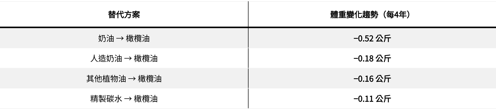 在研究裡的替代分析中,研究團隊模擬了不同脂肪替換的結果: