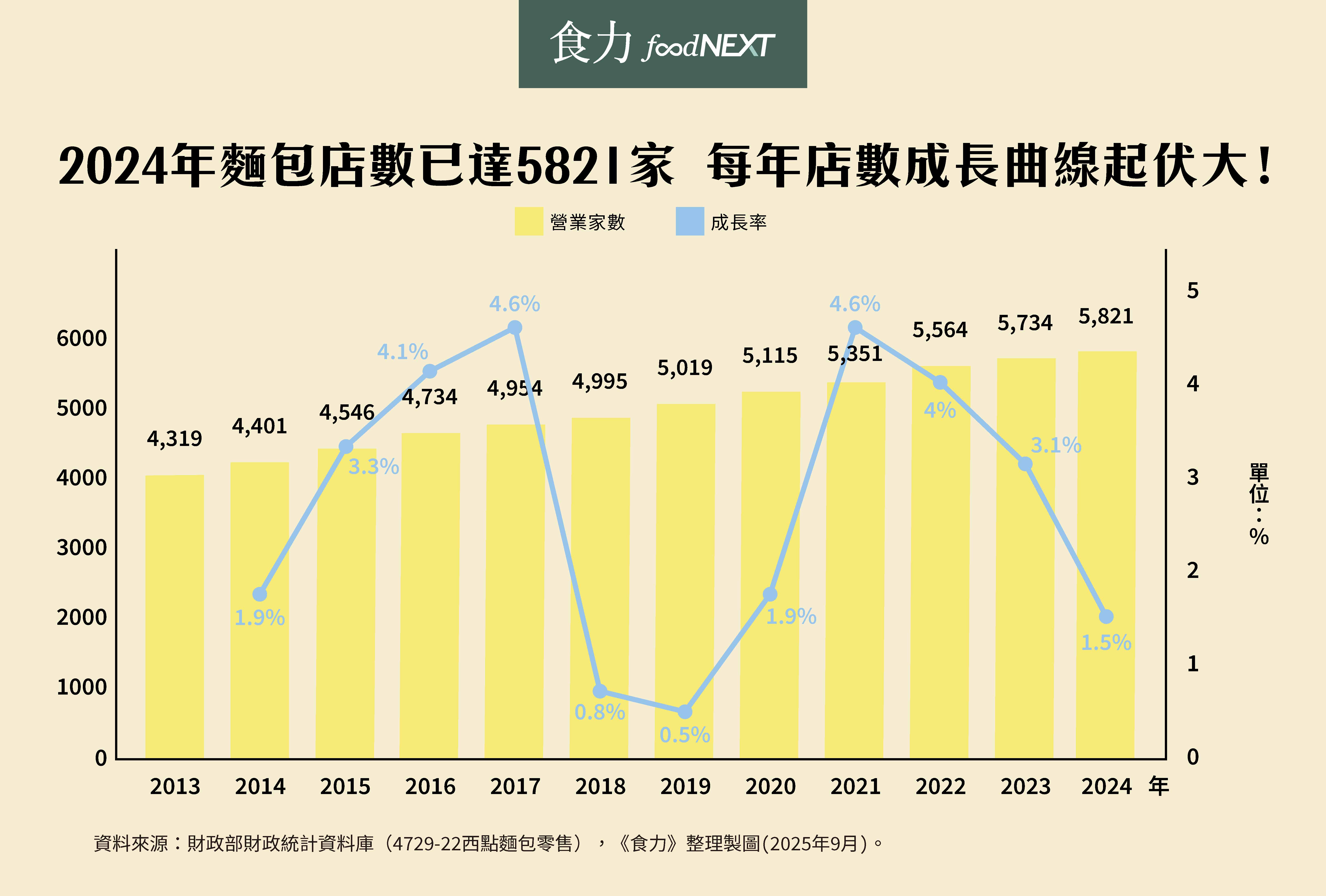 從財政部財政統計資料庫的「西點麵包零售」類別來看店數的變化,2013~2024年間的店數雖呈現正成長,11年間增加了1,502間,總體成長率約34.8%,整體來看,市場規模雖然持續擴張,但成長速度呈現波動、高峰成長期已過。