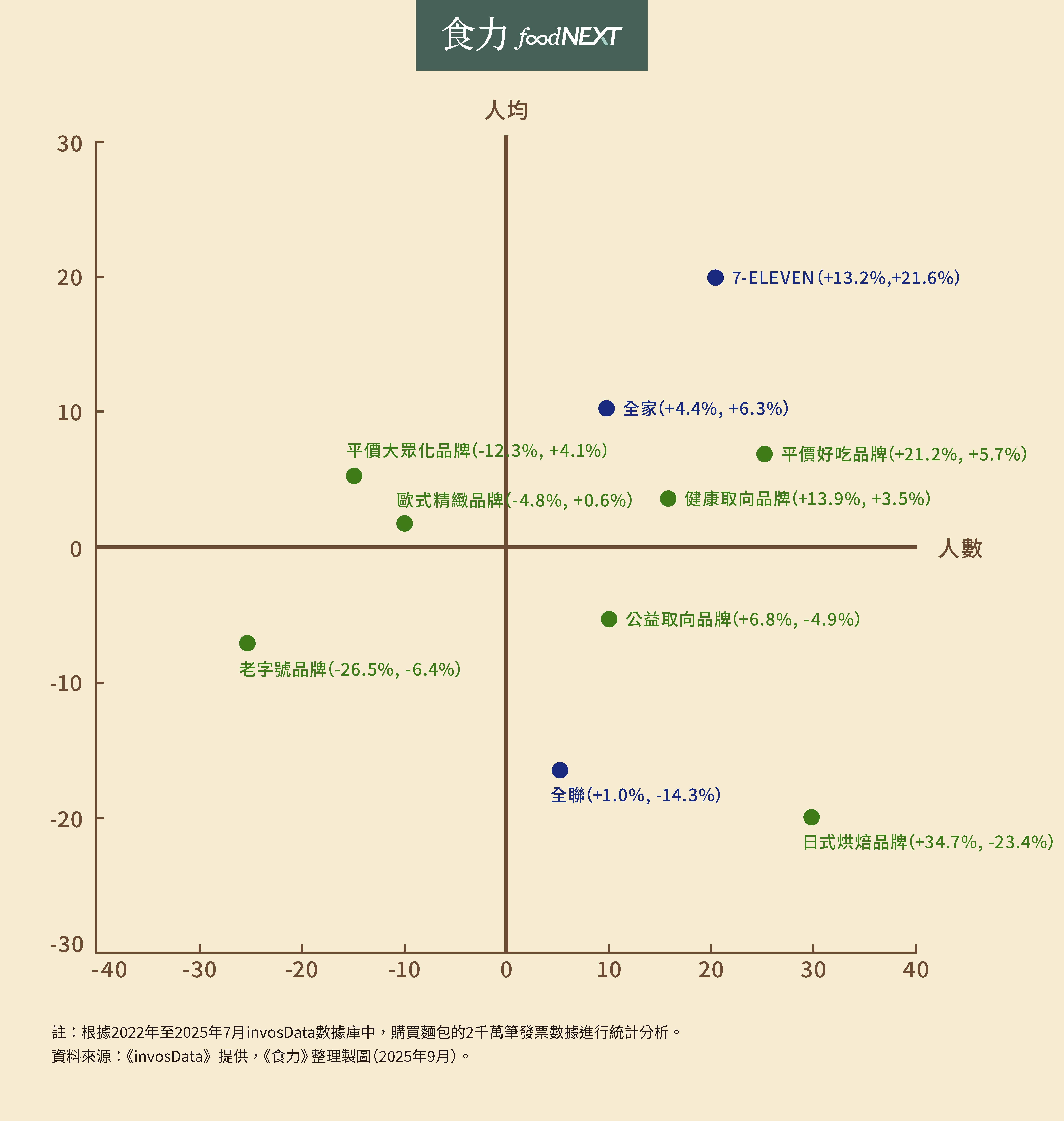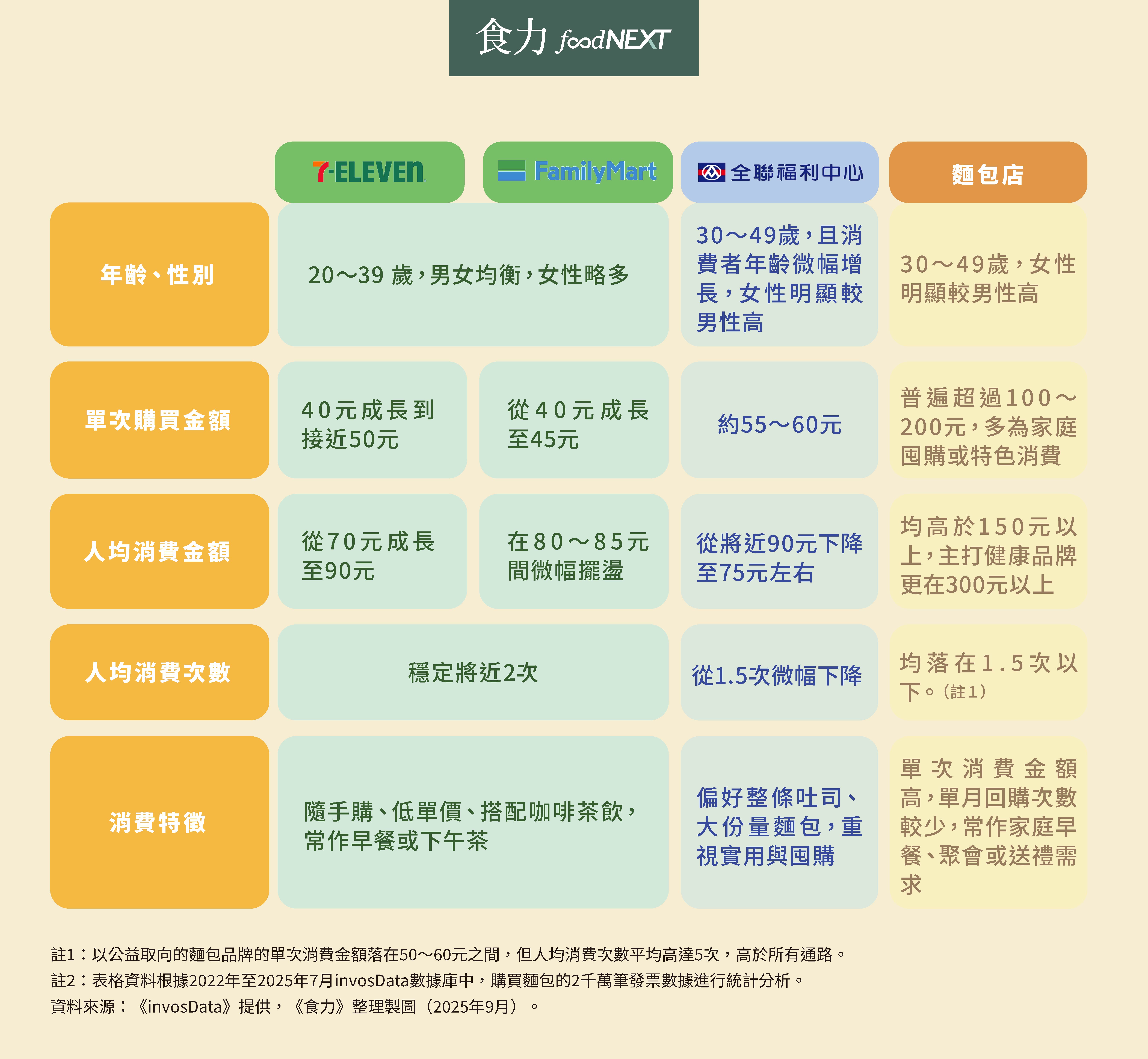 整體而言,超商靠人數規模取勝,主打即時便利以及年輕客群;全聯與麵包店則以單次金額提升價值,主要滿足家庭備餐需求;而麵包店又強調特色消費的取向,例如公益取向品牌的產品,讓支持其理念的消費者願意重複回購,而健康取向品牌也吸引一批支持者,讓消費人數與人均消費金額持續成長。