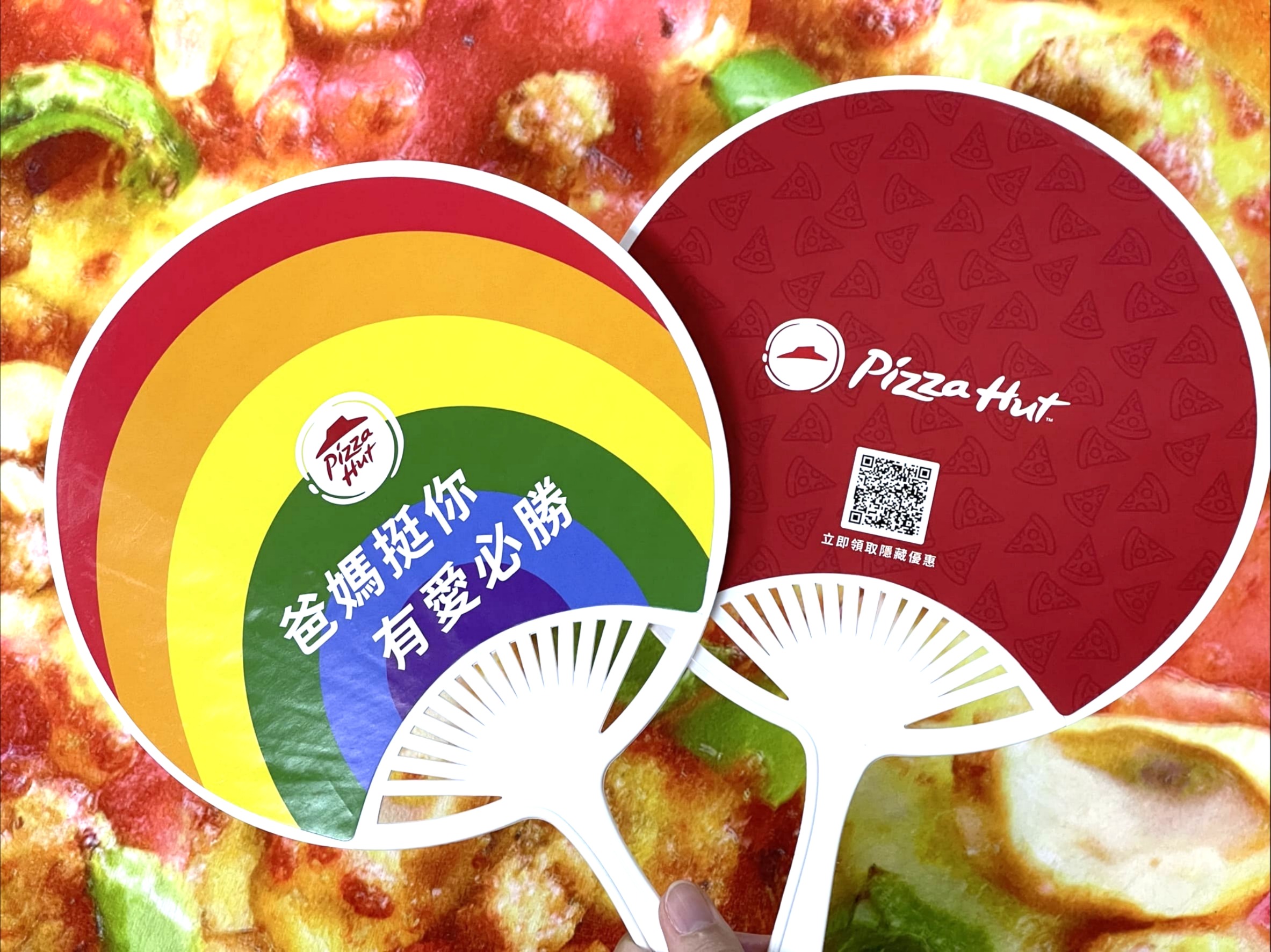 10月25日當天於遊行、市集中追蹤必勝客官方社群即可獲得彩虹應援扇、切片美式臘腸愛心比薩、必勝客優惠券等好禮!(圖片來源:必勝客提供)