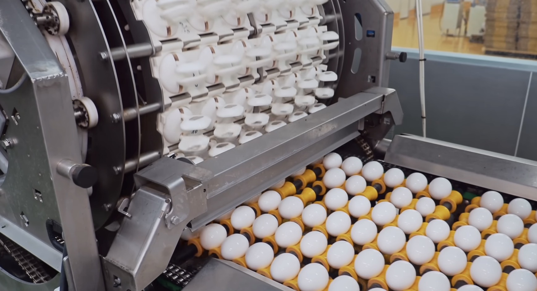 雞蛋在輸送帶上清後後,透過機械手臂的抓取,正準備進入風乾的過程。(圖片來源:協興蛋業提供)