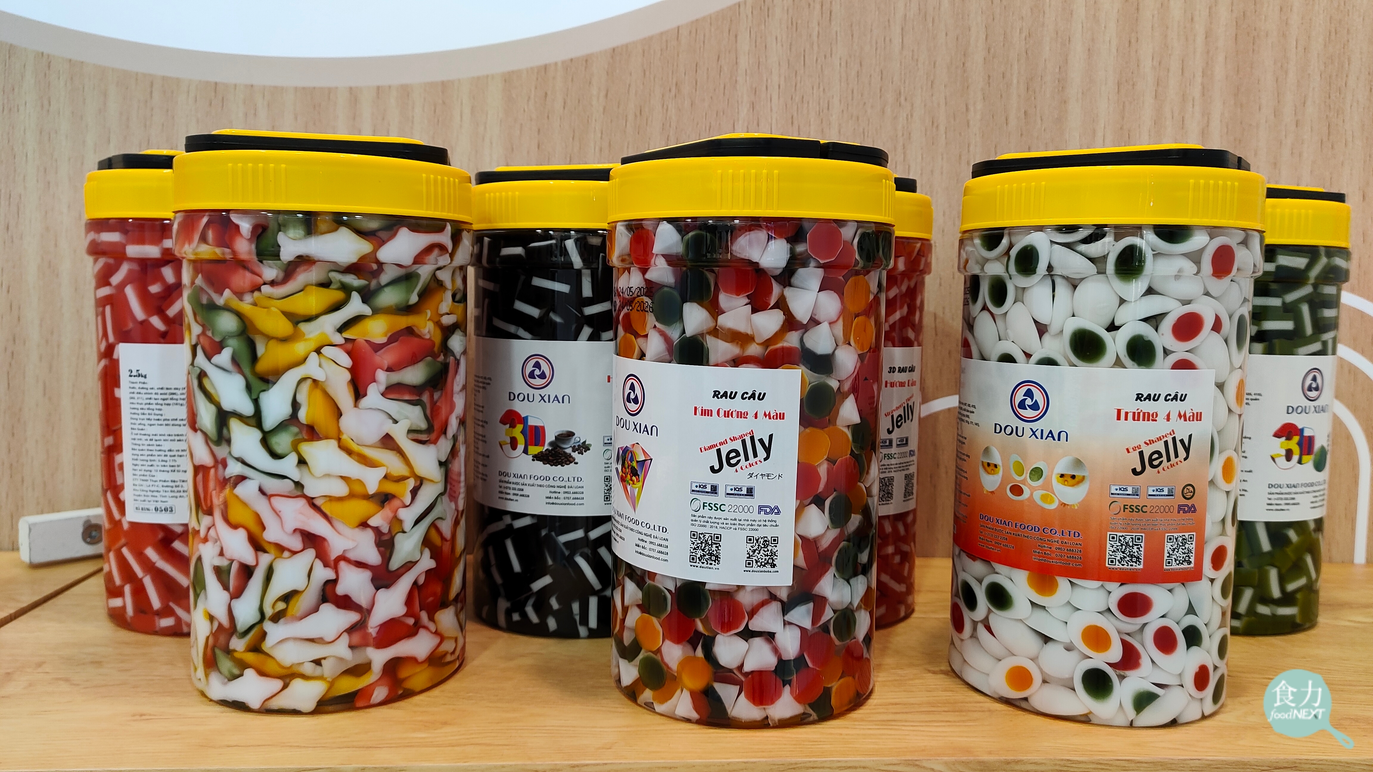沒有華麗背板布置的「豆鮮」,卻有一罐罐特殊造型的蒟蒻吸引許多目光詢問。這些蒟蒻有小魚形狀、鑽石形狀、小雞蛋、愛心,色澤鮮艷,在台灣廠家裡面從未見過。