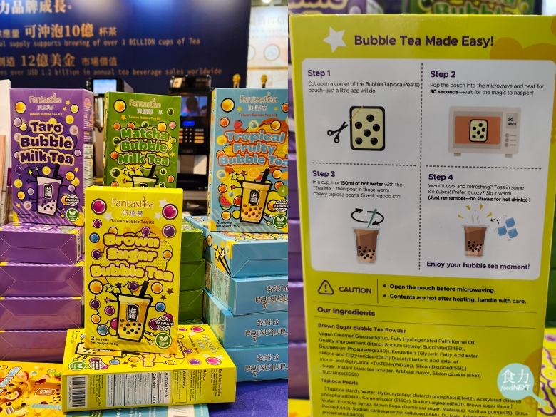 這個特別為本屆食品展製作的自有品牌商品,背後有一個小故事。就是該產品其實早在一年前就以OEM方式上架在英國連鎖超市,當地一個月要進口一貨櫃相當熱銷,義大利代理商無意中得知後表示「台灣是珍珠奶茶發源地,最正宗」,即使當地有人可供應原料,他們仍向東爵下單,而這也促成東爵加速拓展歐洲市場。