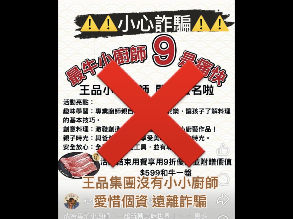 王品集團目前已針對詐騙廣告展開蒐證、檢舉,向警方報案,並將追究相關民刑事責任,強調對於詐騙絕不寬貸。集團官網、王品瘋美食App、各品牌官方社群平台也發布防詐騙公告,提醒民眾提高警覺,強調集團旗下各品牌皆無舉辦「小小廚師」活動,也無租借場地給任何單位舉辦相關活動,請民眾小心提防各種詐騙手法,保護個資,遠離不明LINE群組邀約。如有相關疑問,請撥打165反詐騙專線或洽詢王品集團客服專線0800-071-198,杜絕不法詐騙。