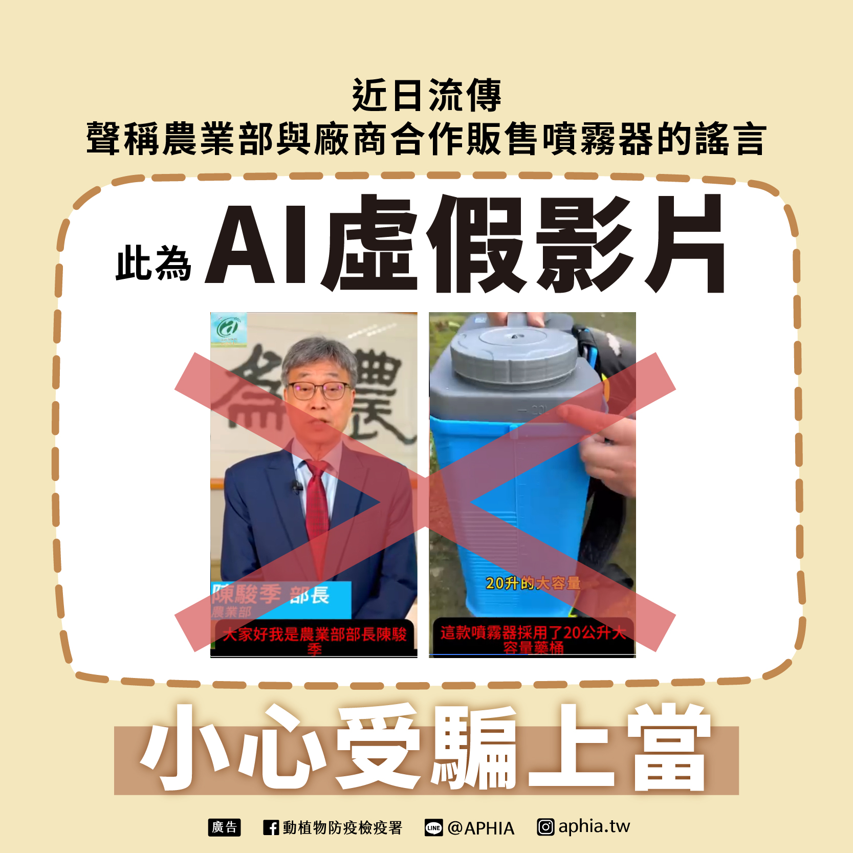 關於網路上流傳一則農業部陳駿季部長的短影音,內容指出「農業部與廠商合作販售噴霧器」、「農業部請民眾在家進行消毒,尤其是有養家畜的」等等,杜文珍也表示,防檢署已經對外作澄清,該影片是AI剪輯變造的虛假影片,請民眾勿信,也請大家協助澄清。同時杜文珍也再次強調,非洲豬瘟僅會感染豬隻,不會傷害毛小孩,飼主不必太過擔心。