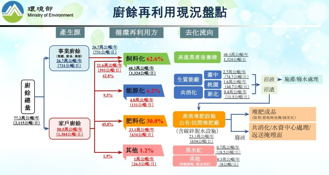 目前全台每日產生約2,115公噸廚餘,其中家戶廚餘約1,384公噸,事業廚餘約731公噸。其中,有62.6%廚餘飼料化再利用,作為養豬飼料來源。