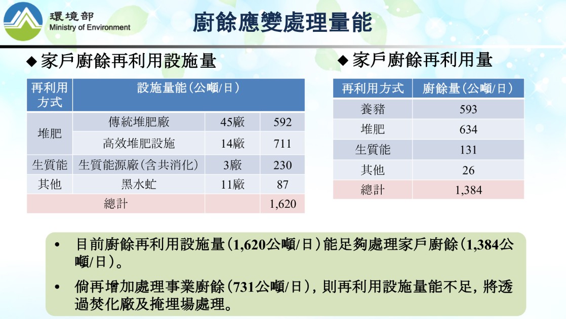 全台現有廚餘再利用設施總處理量能約每日1,620公噸,足以應付家戶廚餘量(1,384公噸/日),但若同時處理全台435家養豬場廚餘,量能將出現缺口。環境部指出,隨著廚餘禁止用於養豬,短期內勢必增加焚化與堆肥系統的處理壓力,地方政府應提前調度與整合資源,避免廚餘堆置或回收中斷。