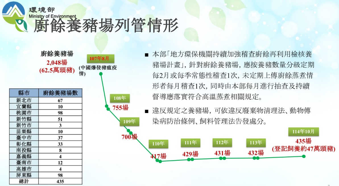 環境部「地方環保機關持續加強稽查廚餘再利用檢核養豬場計畫」,針對廚餘養豬場,應按養豬數量分級定期每2月或每季常態性稽查1次,未依規上傳蒸煮紀錄者需每月稽查。違反規定者可依《廢棄物清理法》、《動物傳染病防治條例》或《飼料管理法》予以告發處分。