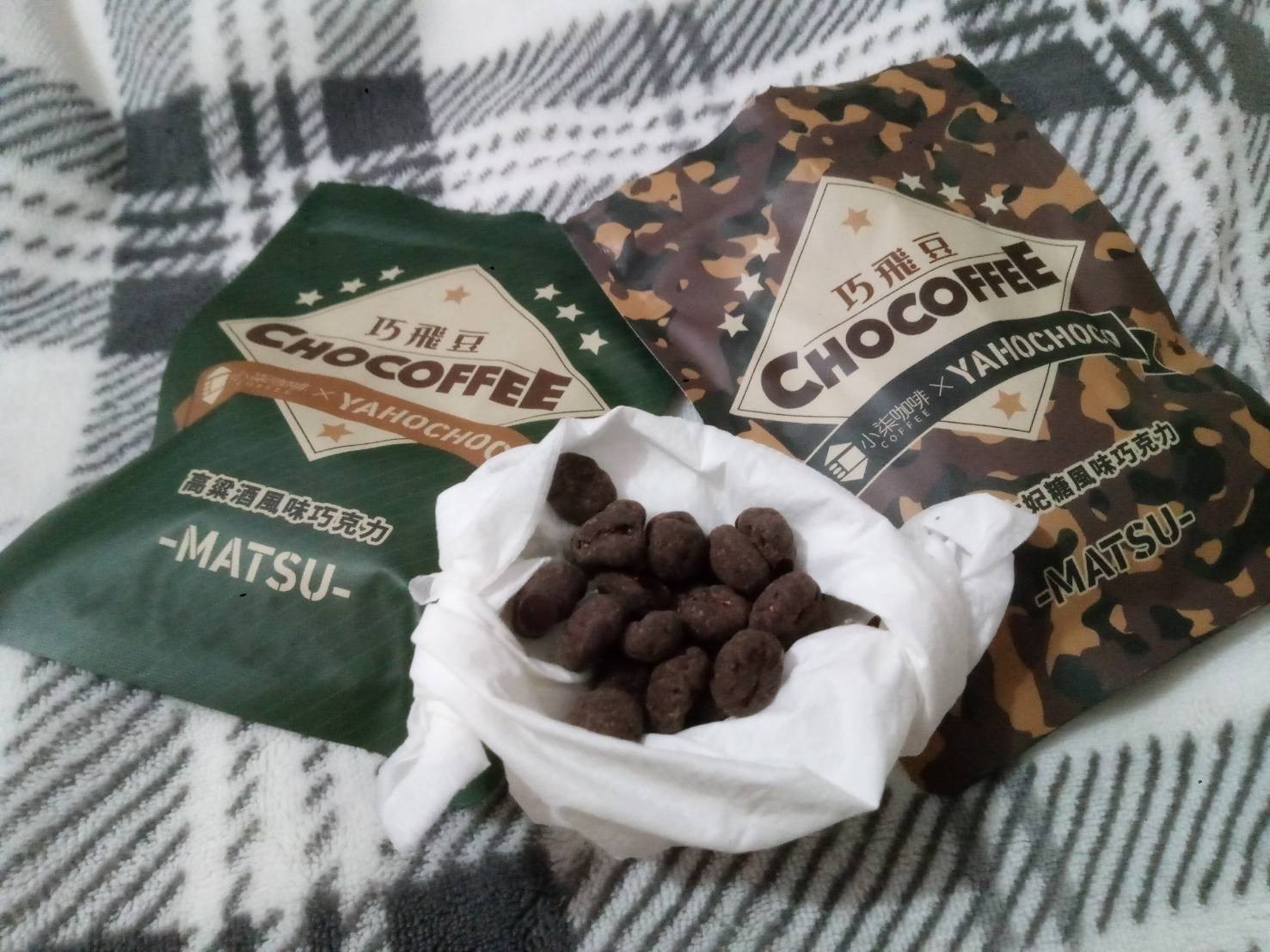 來自新北的試吃員吳小姐分享,「巧飛豆有兩種口味,堅果太妃糖與高粱酒,前者太妃糖的甜度恰到好處,柔和了咖啡豆原本的微苦,甜而不膩;後者打開包裝就能聞到淡淡酒香,最後高粱酒的香氣在口中散開。」