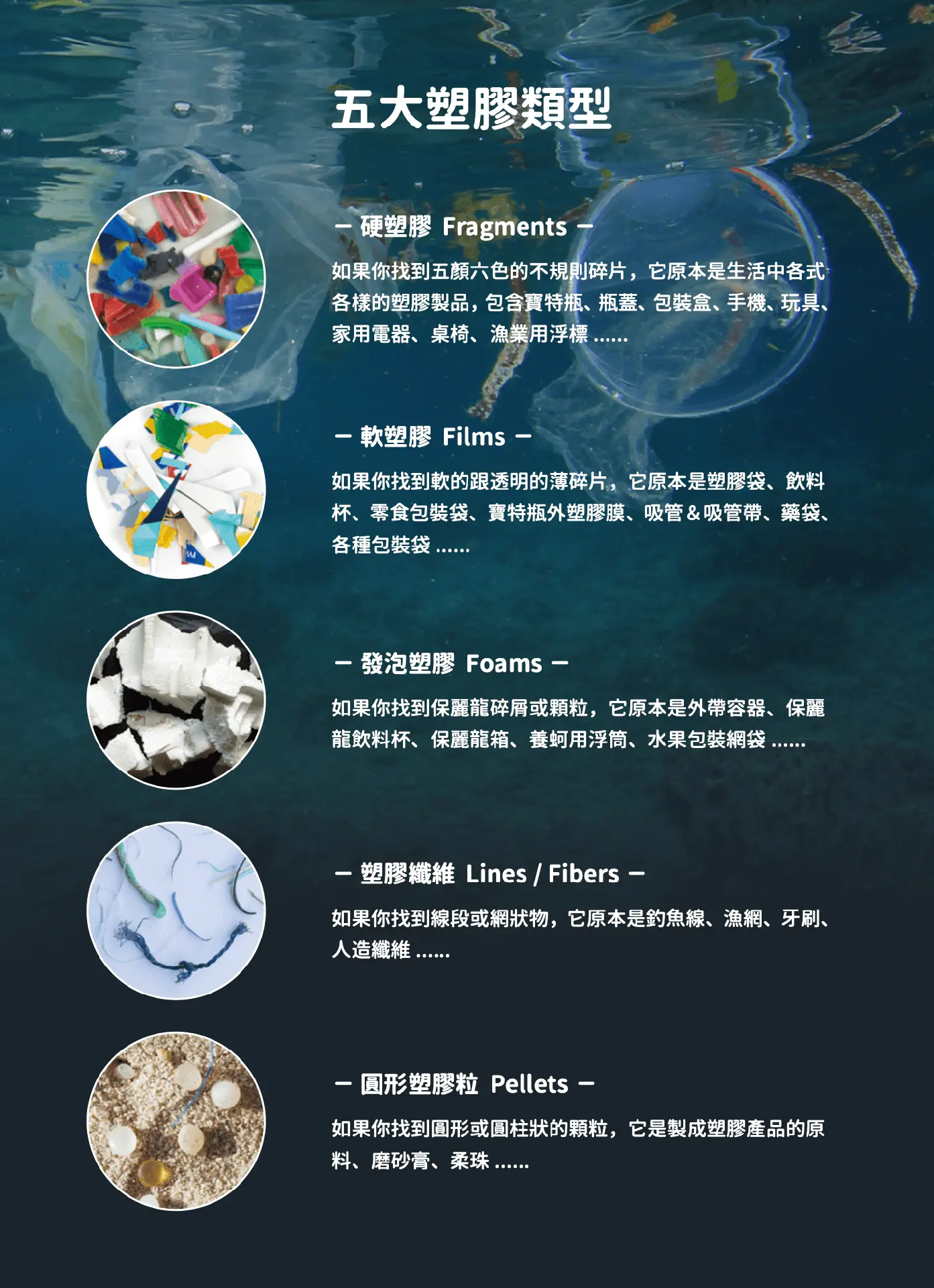 如果將塑膠分成五大類型來統計,可分成硬塑膠、軟塑膠、發泡塑膠、塑膠纖維、圓形塑膠粒。(圖片來源:灃食公益飲食文化教育基金會提供)