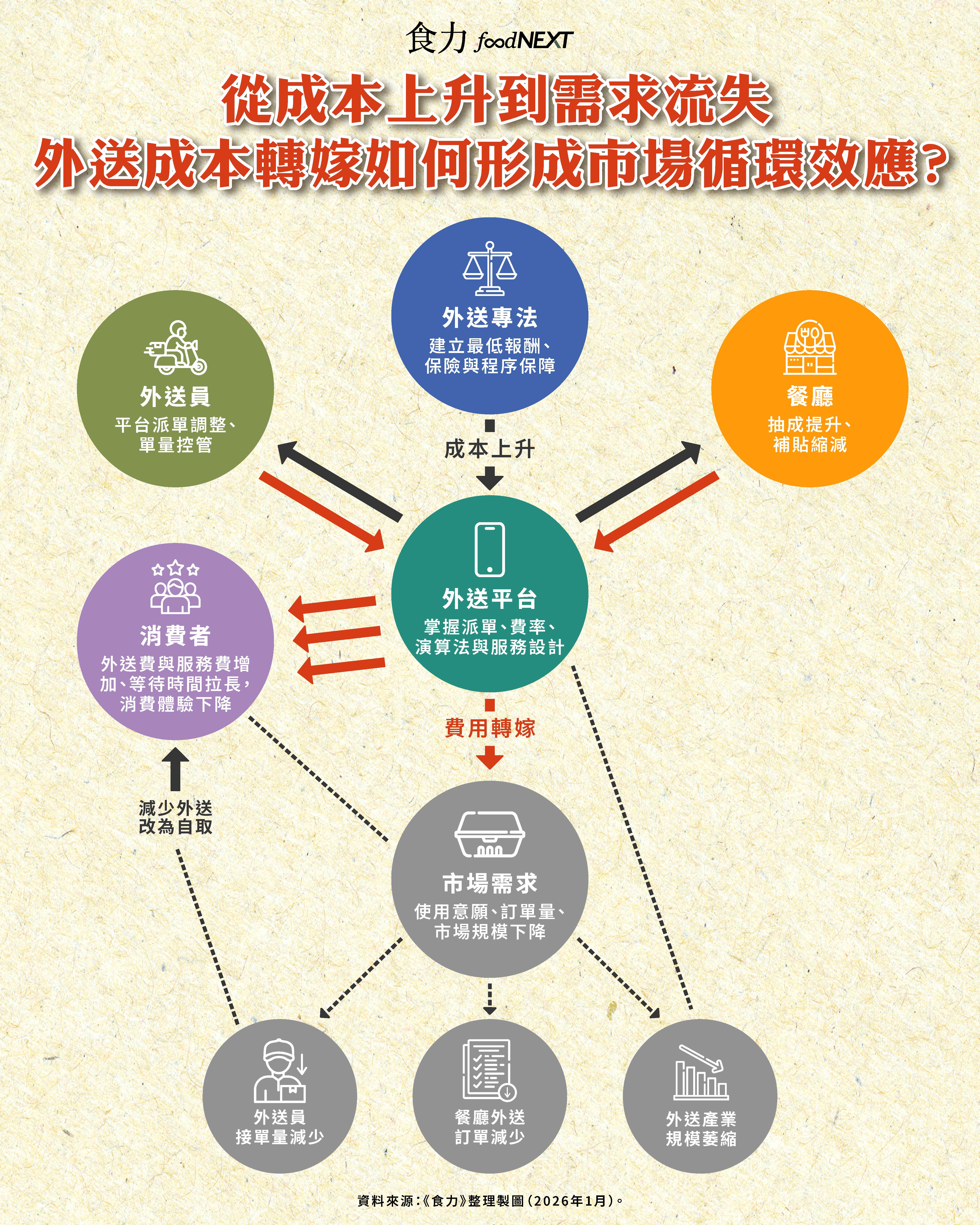 外送專法為外送員建立最低報酬與制度保障,補上長期缺口,卻也同步改寫了平台的成本結構。當成本上升,問題不只在於「會不會轉嫁」,而在於轉嫁之後,市場會如何反應。平台、餐廳、外送員與消費者之間的關係,正形成一條環環相扣的循環鏈。若消費者因價格與體驗而離場,整個外送市場將同步縮水,反過來衝擊原本欲保障的勞動與產業。