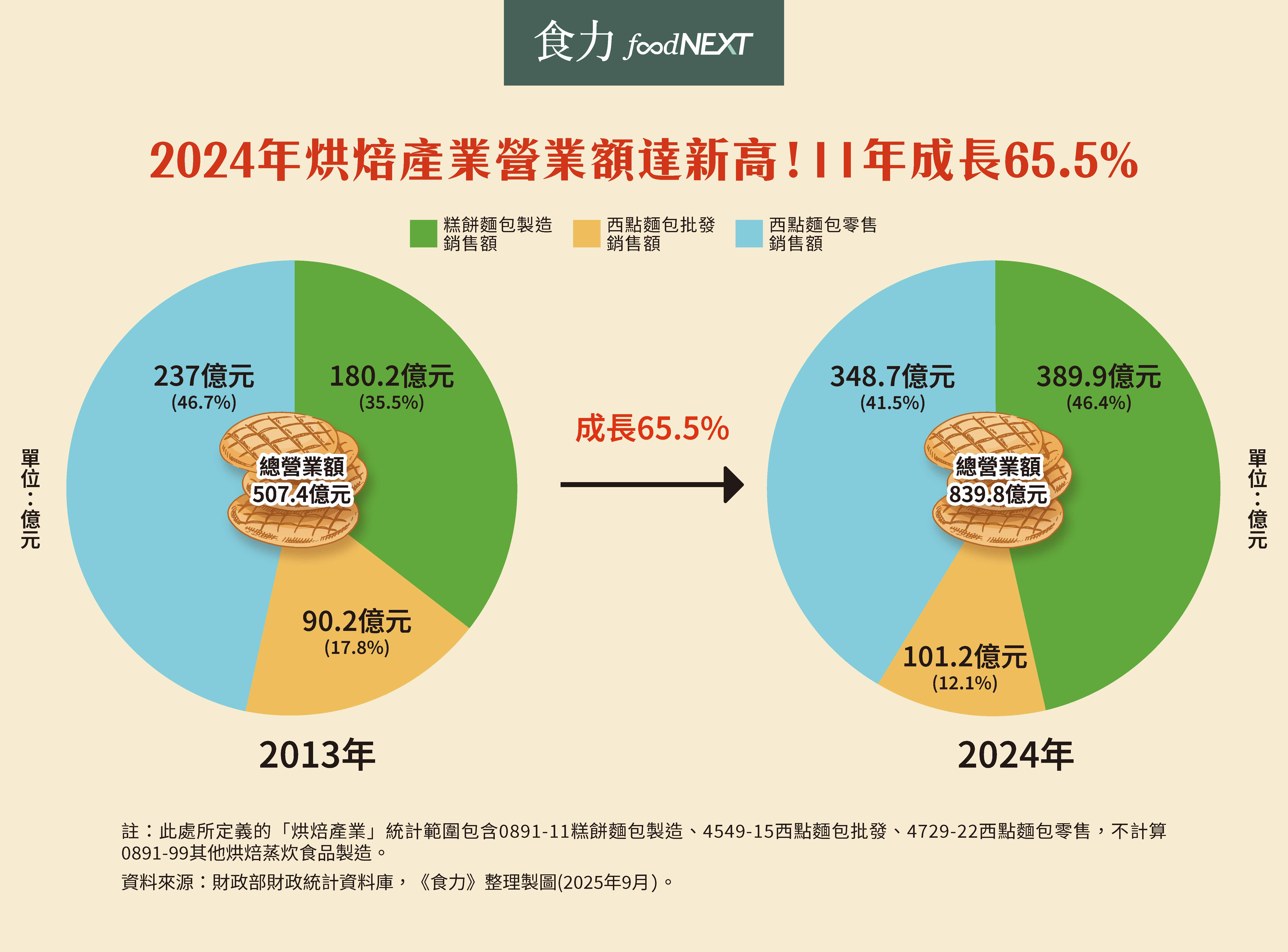 根據財政部財政統計資料庫,若以糕餅麵包製造、西點麵包批發、西點麵包零售三個次產業來定義「烘焙產業」,2024年的產值正式突破839.8億元,創下歷史新高。從數字來看,這是一個令人驕傲的里程碑:從2013年的507.4億元起算,產值成長了超過6成,表面上顯示台灣人對麵包的購買力與日俱增、產業持續成長。然而,事實真是如此嗎?