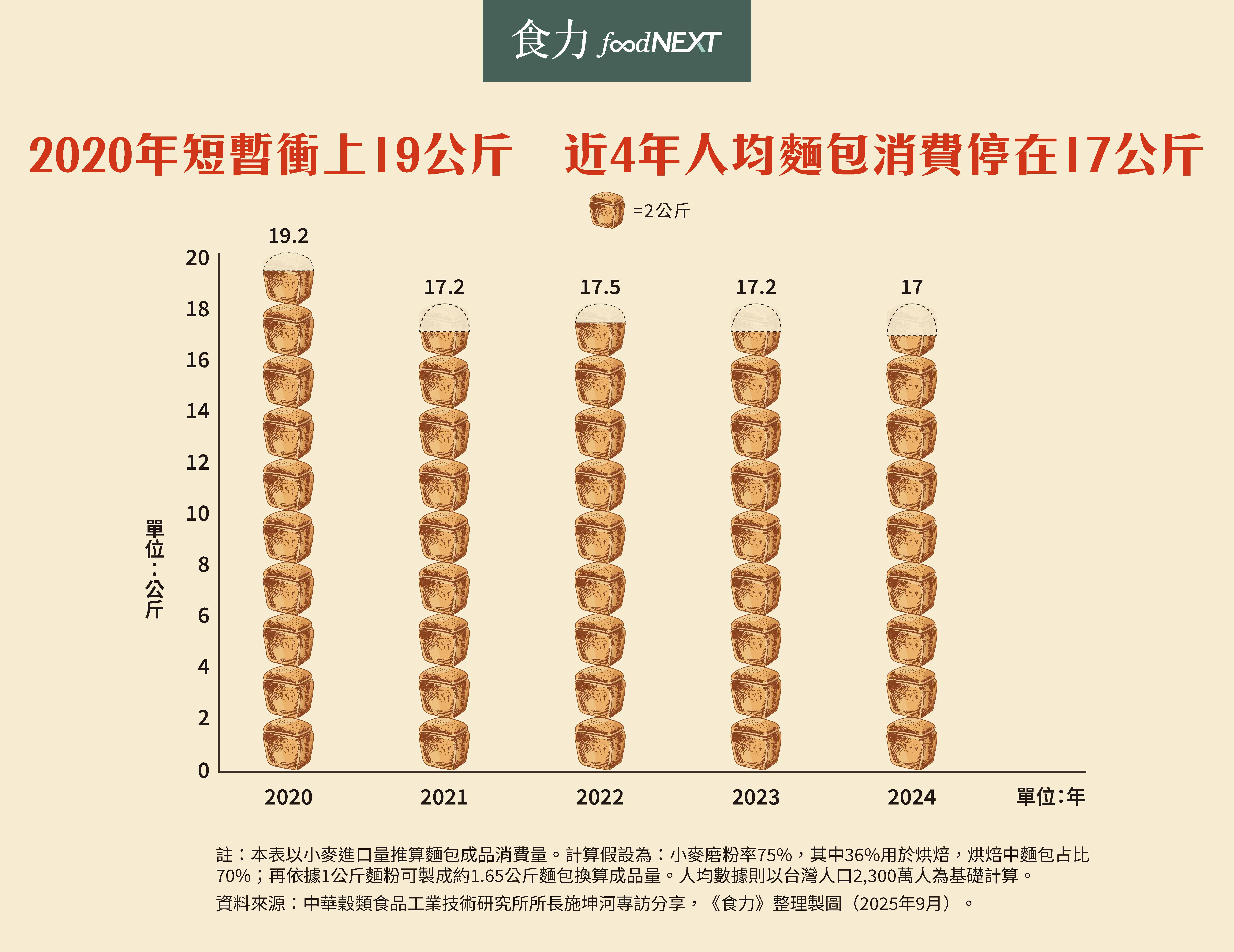 那麼台灣人每年平均吃多少麵包呢?施坤河表示,可以由小麥進口量來推估,1公斤小麥大概能磨出0.75公斤麵粉,其中麵粉有36%會拿去做烘焙產品,而烘焙產品裡頭大約有7成是做成麵包。最後再考慮到,1公斤麵粉大概能做出1.65公斤麵包,就能估算出1年整體麵包製作量。人均數據則以台灣人口2,300萬人為基礎計算,即可得出最終答案。2024年的進口小麥為1,255,667公噸,以此算法計算出來的人均麵包食用量為17公斤。進一步統計2020年~2024年的人均食用量,5年來僅在2020年突破19公斤,近4年人均年消費量始終停在17公斤,幾乎沒有實質成長。