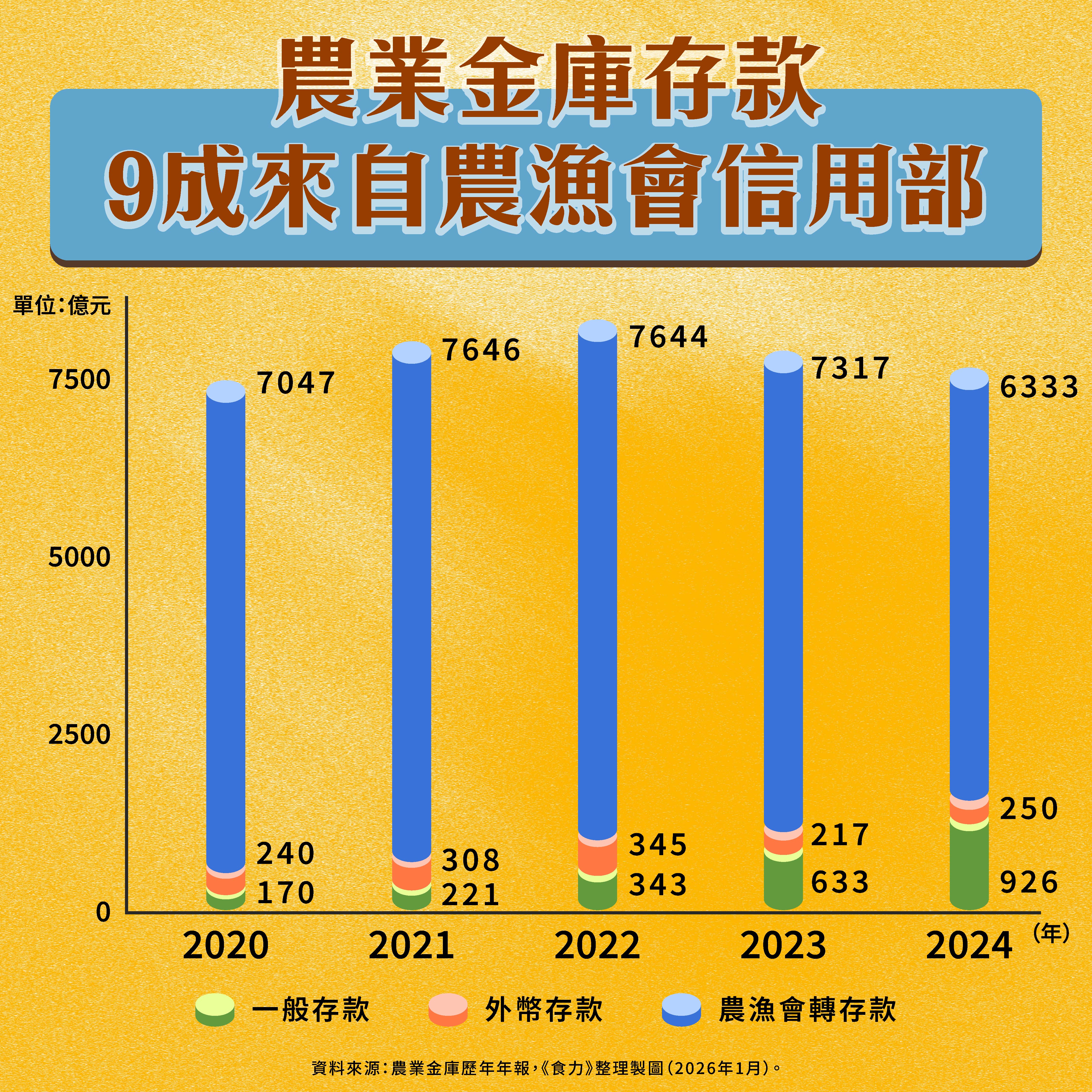 作為全台農漁民靠山的全國農業金庫(簡稱農業金庫),自2005年成立至今21年,是全國311家農漁會信用部的上層金融機構,政府目前持股37.59%,扮演資金融通、業務輔導等功能。因投資外幣債券受美國升息影響,2024年大虧60.19億元,2025年12月自結財報出爐,再度虧損16.99億元,分別為史上第二、第三次虧損。