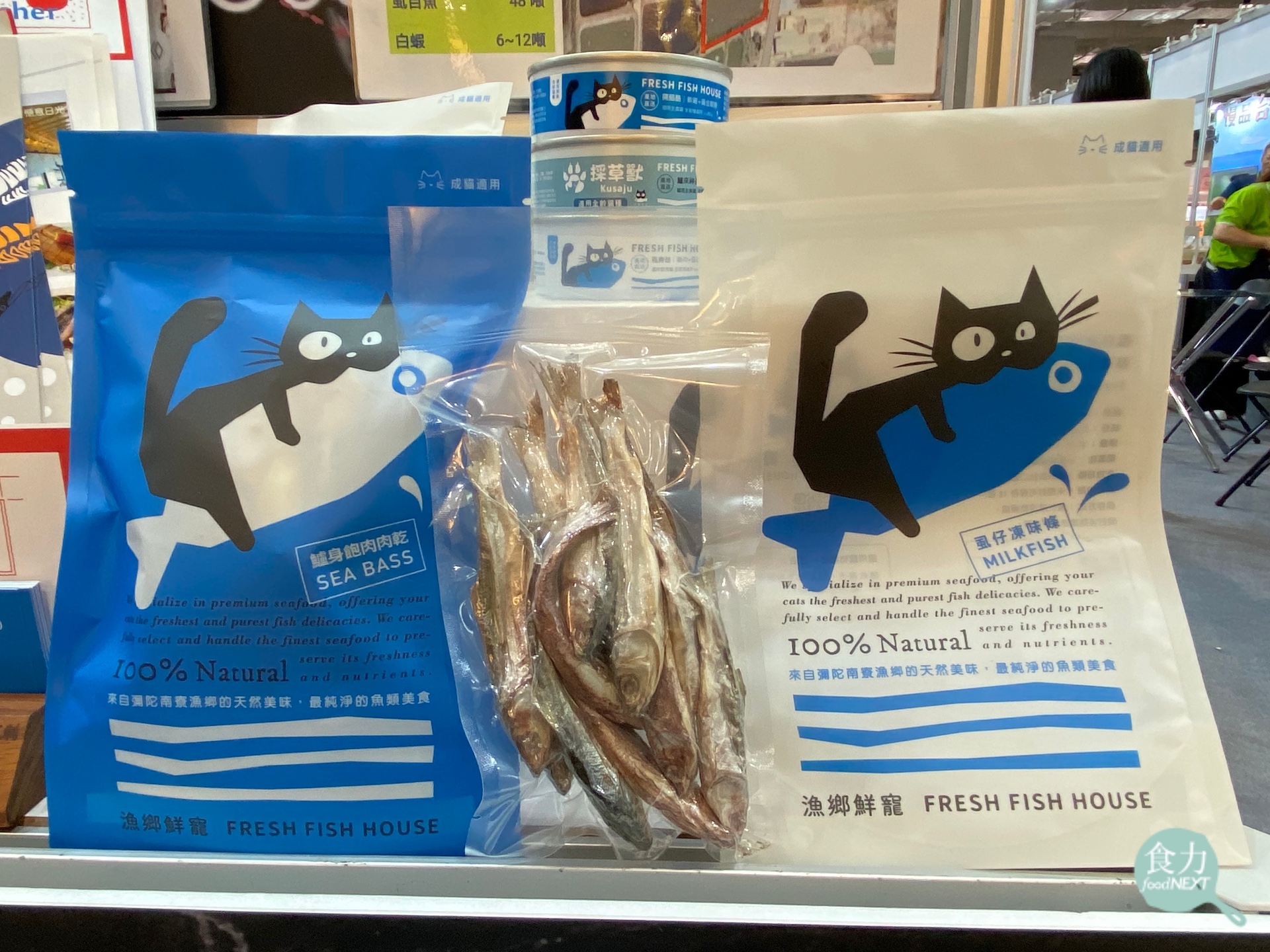 責生有限公司的「漁鄉鮮寵」寵物食品品牌,使用無垢永續生態工法飼養的漁獲作為原料。其中「虱仔凍味條」則是可調節漁獲生產的特殊產品。(黃筱珊攝)