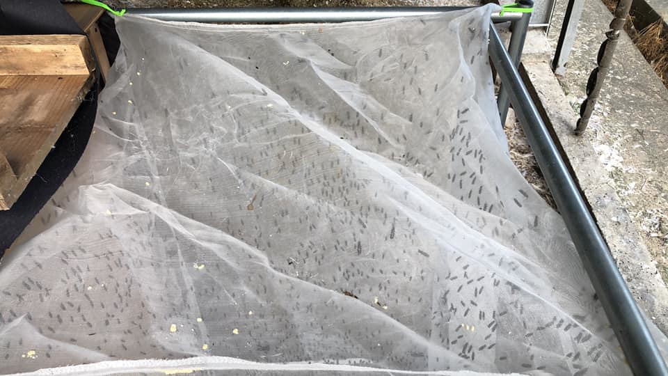 黑水虻養殖本身的技術門檻並不高,但部分業者不熟法規、或便宜行事,容易造成投資失敗。圖為設網讓成蟲產卵。(圖片來源:林信仁提供)