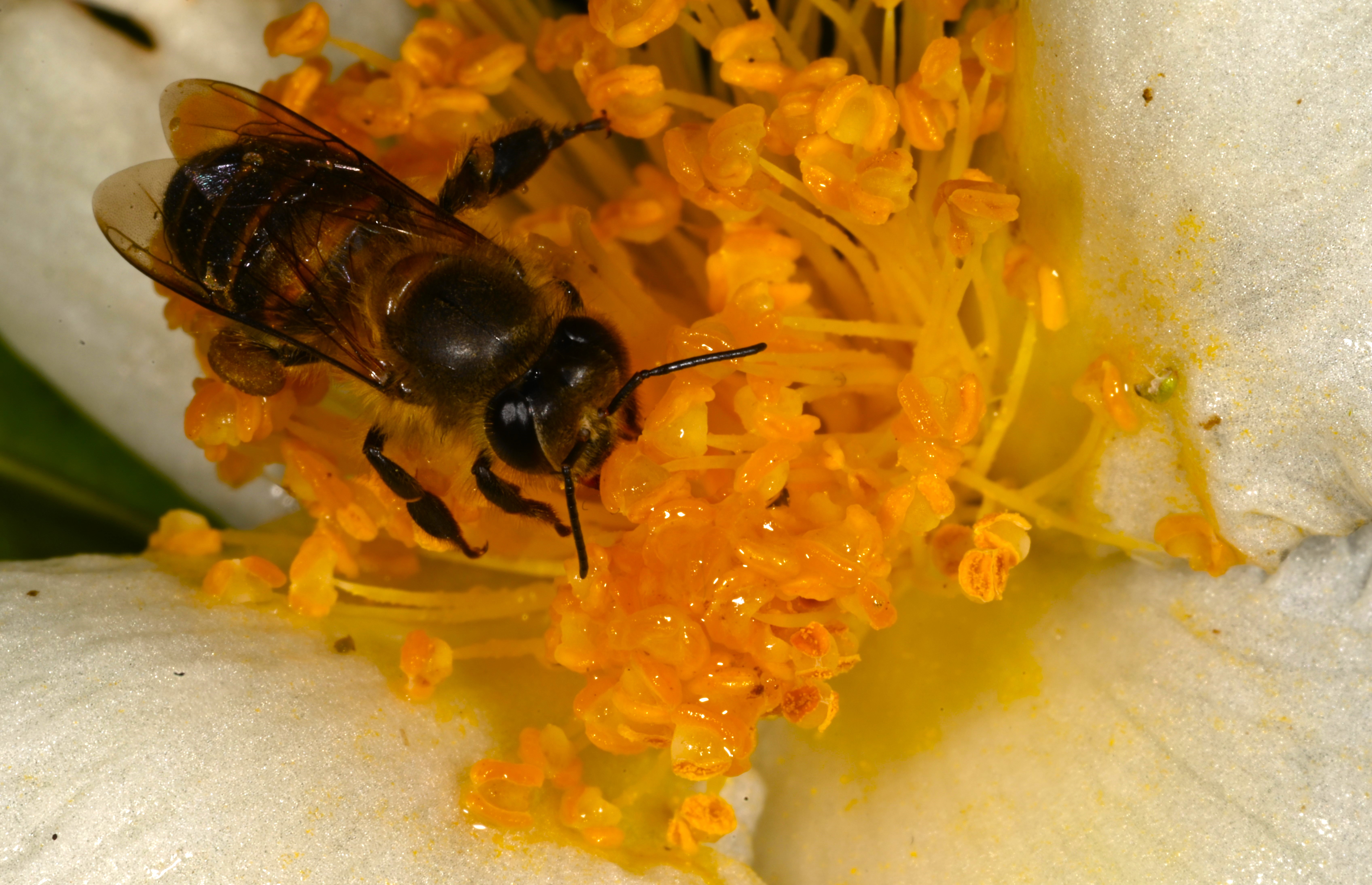 臺灣山茶因豔麗的外表,是典型的蟲媒花,是生產稀有冬蜜的優良蜜源,主要的訪花昆蟲是本土的東方蜂。(圖片來源:林業試驗所提供)