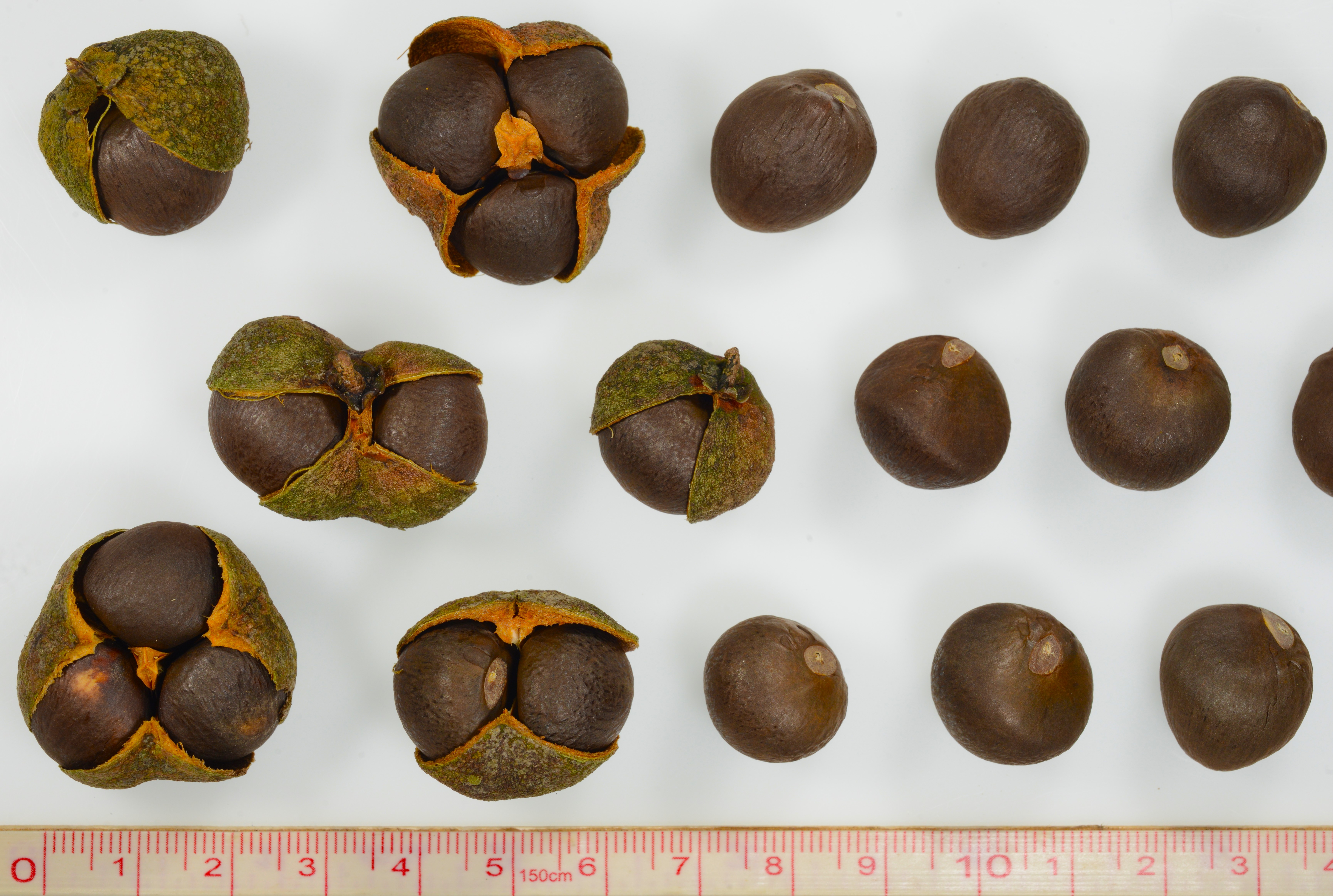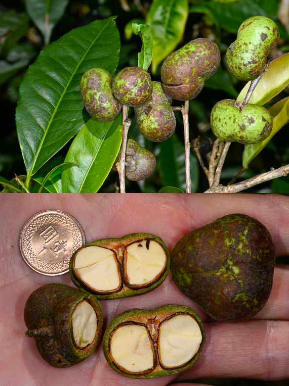 臺灣山茶具備果實成熟與花朵同時綻放的特性,每年11~12月為採收種子的最佳時機。上圖為種子,極難自然發芽,需先經過低溫處理來「喚醒」它,才能大幅提升發芽率。下圖為成熟種子剪切面。(圖片來源:林業試驗所提供)
