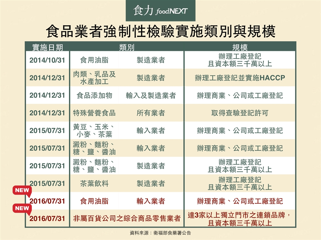 2016年新制上路,強制性檢驗食品業者名單,新增食用油脂輸入業者與零售通路業者,為消費者的食品安全把關。