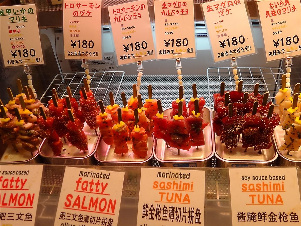 身為腸胃不是很強壯的觀光客,對於這種直接在市場採購生鮮食物難免心存疑慮,但是當我帶著戒心先快速走一遍錦市場時(其實是一時不知道該從何下手),看到攤商的「乾淨」和「井然有序」後,等我往回走時,對於被整齊分類放在冷藏展示櫃的生魚片和熟食攤上的炸物、漬物,不免躍躍欲試。