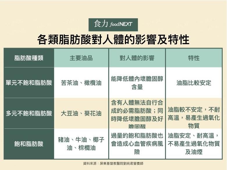 商店架上「食用油」琳瑯滿目,讓人看得眼花撩亂,不知從何選起,怎麼選擇比較恰當有幾項重點必須知道。油脂加熱的過程中如果溫度高於冒煙點〔發煙點〕,其品質會開始劣化,產生自由基,對細胞產生危害,因此屏東基督教醫院劉純君營養師整理各類脂肪酸對人體的影響及特性。