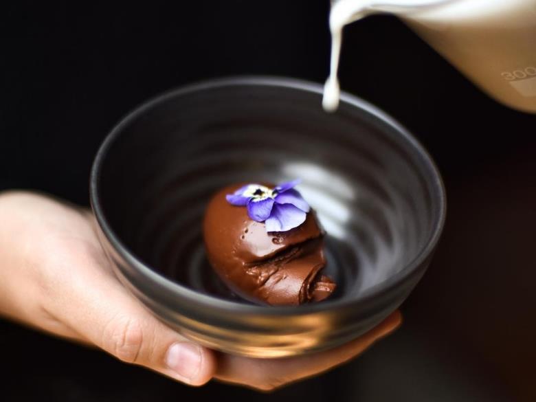 一勺亮滑的黑巧克力,如慕斯般靜躺在瓷碗內,混合著薄荷、橙橘、肉桂的香氣與清爽,綴以一朵可食用的紫羅蘭花。淋上摻有英國傑瑞水手蘭姆酒(Sailor Jerry Rum)的杏仁奶,即可創造出成人才懂的甘味。