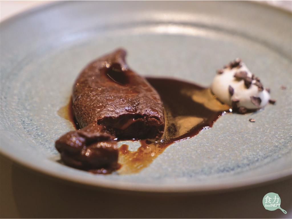 川手主廚則端出Florilege的招牌甜點-來自亞馬遜的禮物。靈感來自其主廚好友致贈的亞馬遜可可,他覺得珍貴,因此特別研發出利用可可調配的英式蛋奶糊(Crème Anglaise),舀入小平底鍋中煎成蛋捲一樣的東西。當晚他佐以打發鮮奶油與可可碎,以及Fika Fika Cafe門市煮拿鐵、卡布奇諾用的「卡布理布里」招牌綜合咖啡豆現場沖煮的espresso,濃郁撞上濃郁,可可與咖啡滋味互相重疊,討喜易吃。