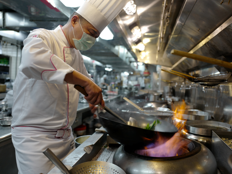 穿上防護衣帽、戴上口罩,雙腳套了鞋套,我們全副武裝走進華泰王子大飯店粵菜餐廳「九華樓」的廚房裡,為了看大廚黃傳明炒一盤豆苗。