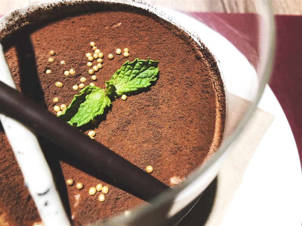 這道稍帶浪漫的甜點,底下餅乾填滿咖啡以及萊姆酒,上面撒上一些蜜豆,湯匙挖下Mascarpone起司,如其名,我帶它走了。