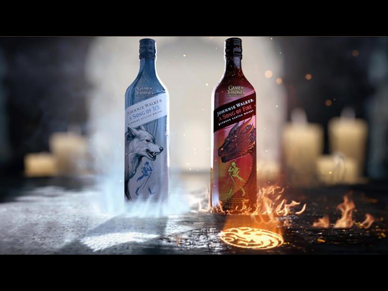 以臨冬城的史塔克家族為靈感的「冰之歌」,象徵「埋山止水的無情雪冰」,混合單一麥芽威士忌而成,酒精濃度40.2度,產自蘇格蘭最北的克里尼基(Clynelish)蒸餾廠,加冰享用最佳,飲後感清爽、冰涼、滑順。「火之歌」則以坦格利安家族為設計意象,產自艾雷島的卡爾里拉(Caol Ila)蒸餾廠,含有加熱麥芽的泥煤燻香,酒精濃度40.8度,同樣是加冰享用,不同的是暖喉、滑順的尾韻。Johnnie Walker的紳士商標除了雪白與火紅顏色上的對比外,也以面對面的方向來影射兩家族的迎面交鋒。