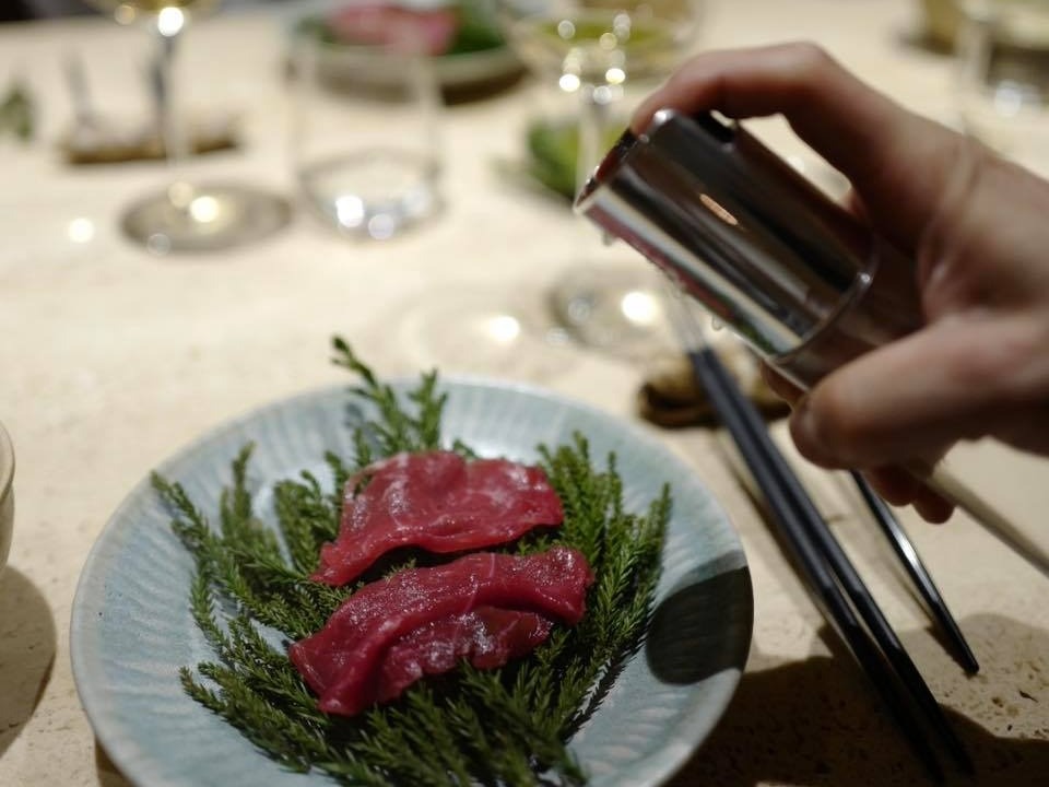 在享用牛後腿心,會噴上主廚自己萃取的柳杉純霧。(圖片來源:美食加TASTER提供)