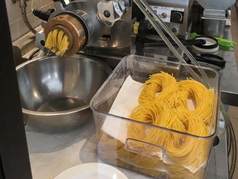 石壁家在店內設置製麵室,讓顧客可以看到麵條被擠壓出來的畫面。(圖片來源:SPIGA 石壁家臉書粉絲專頁)