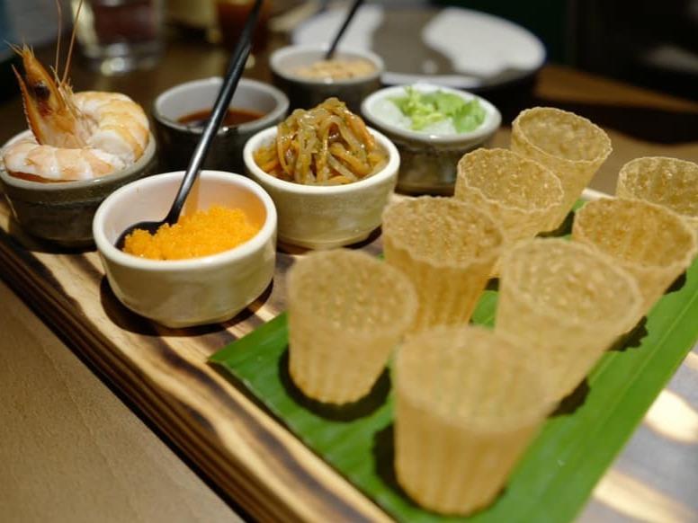 金杯粿在JL Studio也吃得到,那是娘惹菜裡的小點心,薄脆輕透的油炸塔杯,裝填進蔬菜、辣醬與海鮮,來到Chope Chope也有吸睛好看的呈現,6個小缽分別裝著花生、香菜、甜辣醬(chili ketchup)、魷魚炒(海蜇皮)、蝦卵、蝦肉,我們的任務就是動手把這6種配料美美放入塔杯裡一口吃掉,香酥脆爽鮮甜鹹辣一次爆發,胃口馬上開。