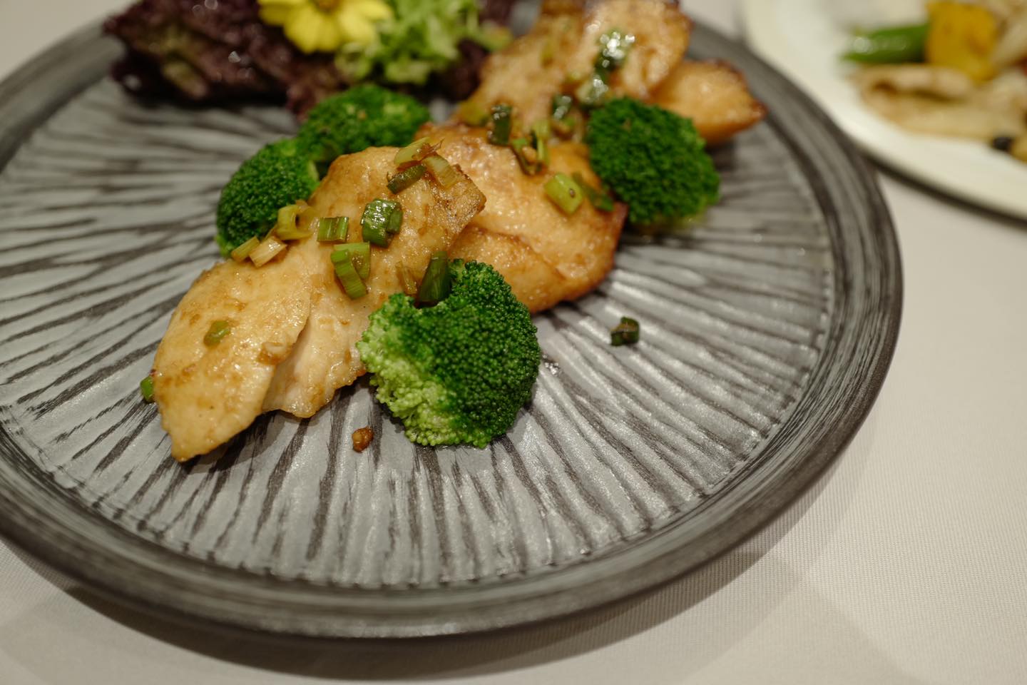 「煎封鯧魚片」是新菜,富哥抵台後通過的菜色,選用將近兩公斤重的大白鯧,背部切片,拍上太白粉先煎再炸,展現粵菜「乾身」的香口,再與蔥和醬油爆炒,簡簡單單卻鹹香有味,正是素材本身的魅力。