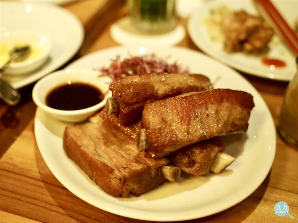 現煮麵與燴飯,大概是整份菜單最有劃時代意義的單元。陳陸寬自己說他不再做義大利麵與燉飯,因為他覺得「我們愈做愈像傻子」,「意義不明」。他想做「屬於台灣的『湯與飯』」,以及「一碗很耐吃的陽春麵或乾麵」。於是我嚐到了特製花椒腐乳汁的鴨肉拌麵,以及台灣便當風味的榨菜排骨飯,吃得爽歪歪。這比義大利人看不起、台灣人吃不懂的義大利麵與飯要好太多太多!花椒與腐乳之噴香與鮮鹹,扒在現煮新鮮拉麵上,彈Q惹味得非常過分。一盤袒蕩蕩無裝飾的榨菜排骨飯,排骨裹的粉偏厚、帶甜、胡椒味重,完全是便當裡的炸排骨,但是是剛炸起來的脆酥酥版,硬生生贏過便當,而下面的飯,是酸菜、榨菜、雞湯的燴飯,醃漬蔬菜的鮮味與雞湯的肉味全煨進飯粒中,好吃得沒天理。