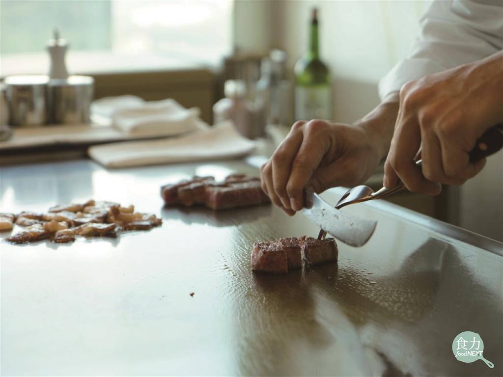 先炒蒜片,用的是UKAI與青森農場契作的「白六瓣」大蒜,個頭碩大,膚色白皙,不說還以為是荸薺。蒜片由透白轉褐黃後,牛肉上鐵板,當天使用沙朗與臀肉,煎至外殼焦脆、內裡嫣紅的三分熟。
