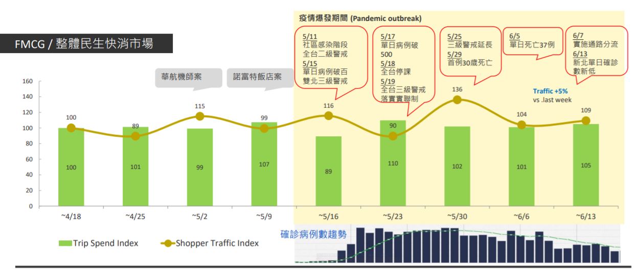 6月中疫情逐漸趨緩,但開始實施通路分流,民生快消品客流量僅小幅回升5%。(圖片來源:凱度消費者指數提供)