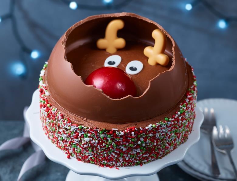就像健達出奇蛋為小朋友帶來興奮心情和喜樂,聖誕節的甜點也可以加入眾人同樂的元素,延長相聚的歡樂時光。ASDA推出的「叮噹麋鹿蛋糕」以巧克力海綿蛋糕為底,上層是牛奶巧克力製成的圓頂;消費者首先得敲開牛奶巧克力的外殼,露出隱藏在內的卡通麋鹿圖案,接著再敲開麋鹿的紅鼻子,找出驚喜小點心,對大人小孩都是開心的娛樂。