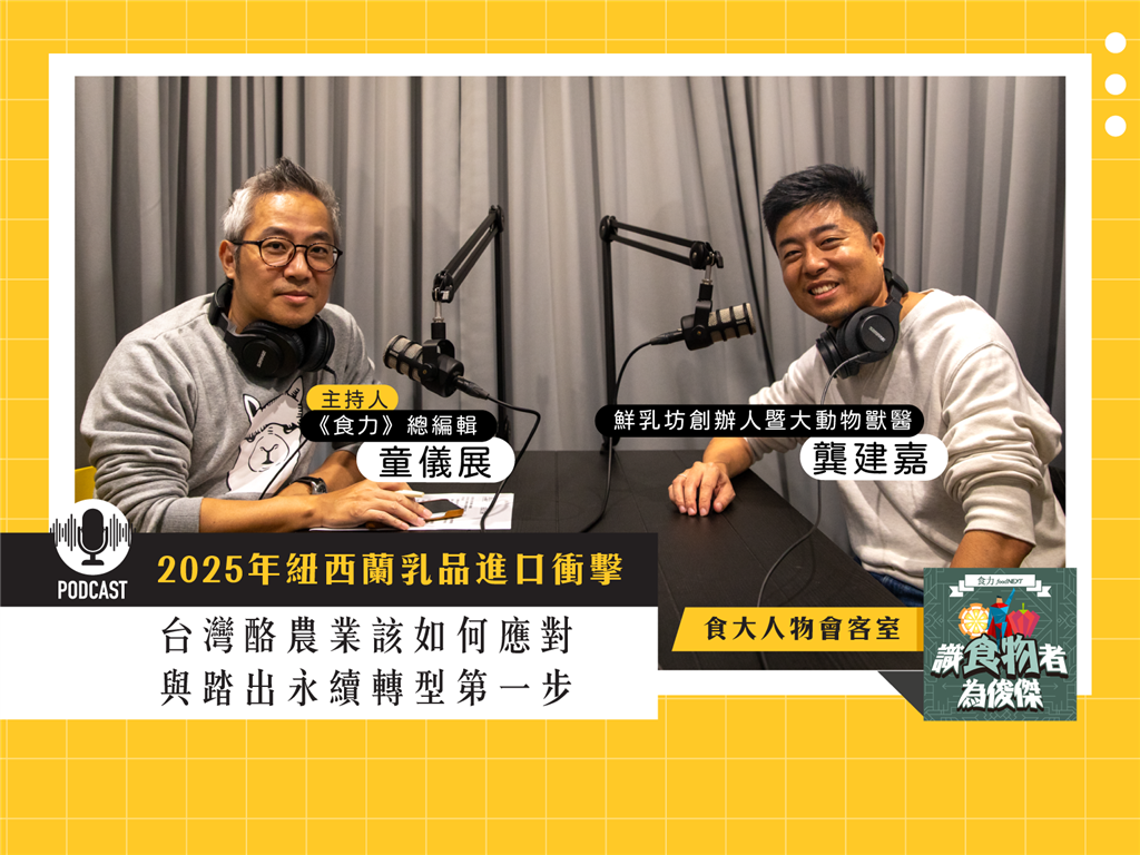2025年台灣即將開放紐西蘭乳品零關稅進口,這一決定將對本土酪農業帶來前所未有的衝擊。在這場挑戰中,《食力》podcast頻道「識食物者為俊傑」的【食・大人物會客室】單元,邀請鮮乳坊創辦人龔建嘉「阿嘉」,一同探討台灣酪農業面臨的現況、困境以及可能的轉機。