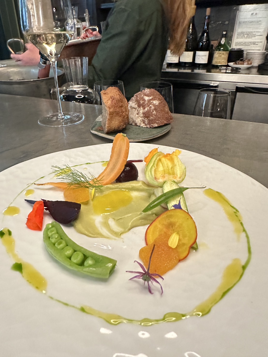 首先上桌的是綜合時蔬、碗豆、胡蘿蔔、節瓜花...等時令蔬菜,食用花卉和野果,每一樣都是生的,淋上蔬菜泥油醋醬,口感清爽脆甜,顏色宛若繽紛的調色盤,將春天的色彩納入盤中,盤中有苦有澀有甜有鹹,再搭配酸度很高的香檳,作為開胃菜啟動味蕾,再合適不過了。