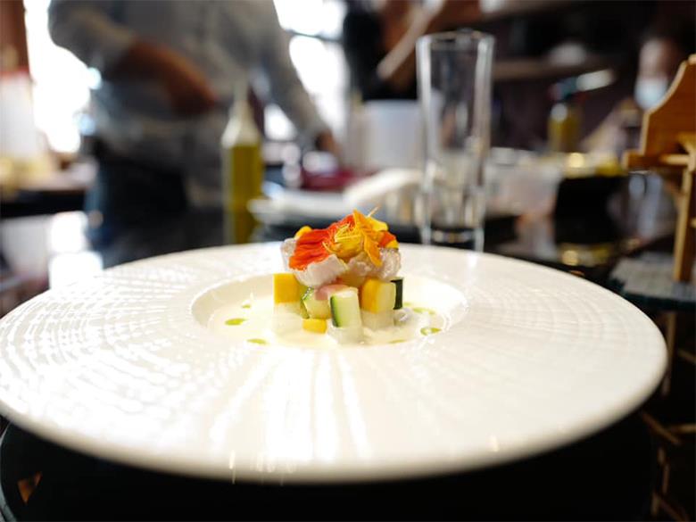Kuni主廚先組合經過鹽漬的櫛瓜與冬瓜、生火腿、核桃與馬鬱蘭,放上表面炙燒過的虱目魚(沒有鯷魚就用台灣的虱目魚!),再淋上起司露與羅勒油!看似天馬行空的食材組合,卻意外地平衡有致,起司露微酸微鹹,帶點煙燻氣息,貼切串起每一樣素材,創作成功。