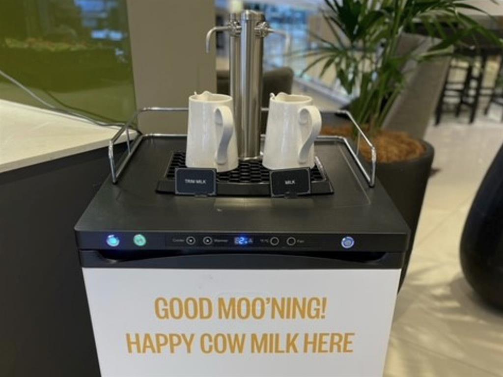 眾所皆知,紐西蘭是牛乳大國,代表新鮮、純淨、美味的高品質。紐西蘭全國1年平均喝掉4億3千5百萬公升的鮮乳,市面上每分鐘賣出190瓶2公升的鮮乳,其消費量排名全球第三。由此可以想像,每年居家和咖啡店丟進垃圾場的牛奶塑膠瓶好比一座小山,這與翠綠草原的零污染形象產生矛盾;事實上也是任何酪農國家都會面臨的挑戰。蘇迪瑪奧克蘭機場飯店(Sudima Hotel Auckland Airport)正視這個問題,並成為全國第一間引進「鮮乳龍頭」設備的旅館。