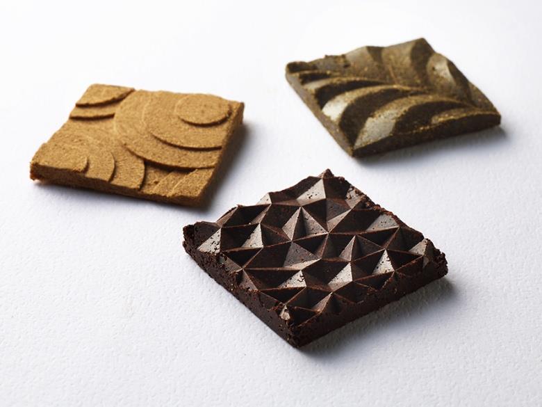 江藤創造的「ECOLATE CARRE」是一款含有3種口味的一口方形巧克力,以可可亞豆的殼、枝、葉做為視覺形象,分別設計了褐色的鑽石切面形、金黃的圓形、墨綠的葉形。褐色巧克力添加了50%的可可亞豆殼,富有豆殼的口感和奶油的香。金黃色的巧克力含有20%的樹枝,微微帶著樹枝的香氣與口感,在舌上能感受到木頭的質感。墨綠色的巧克力含有殼、枝、葉的粉末共30%,混合成森林的香氣與嶄新的口感。