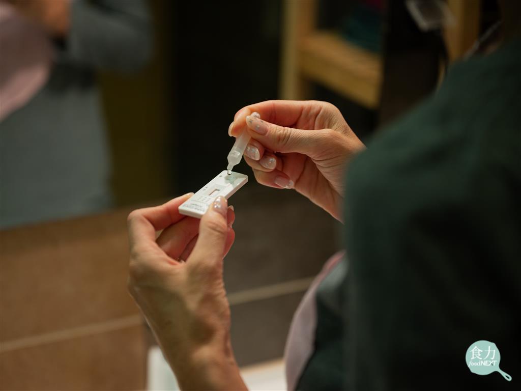 另外,食藥署核發通過的唾液型快篩試劑,檢測原理與鼻腔型類似,唯操作方法略微不同!做唾液快篩前30分鐘應先漱口,之後請避免飲食,才可避免產生過多的干擾因素,再依指示採集唾液,並將唾液與試管中液體拌勻,滴入測試卡匣中,依照說明書時間等待結果。