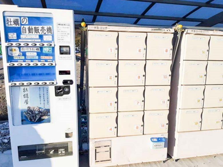 每早從室津港取得新鮮漁獲,由「牡蠣屋」管理販售,其特色是一般自販機旁另設有兩部大型的冷凍置物櫃,原來購買的步驟是連動的。首先,在自販機選擇牡蠣的種類——混合、產季最大、或小型,按下按鍵後會掉下一個附上鑰匙的鋁箔包果汁,接著按照鑰匙號碼開啟其置物櫃,就能取得購買的帶殼生鮮牡蠣,最後把鑰匙投入「歸還箱」就大功告成了。真的是很聰明的DIY自販機升級版!