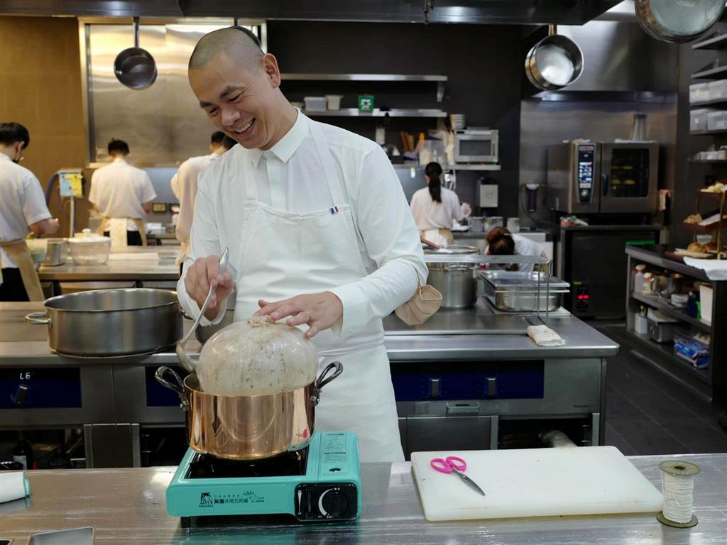 江振誠親手示範法國傳統料理「膀胱雞」。(圖片來源:美食加TASTER提供)