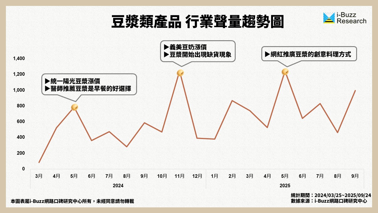 這一年來,豆漿的網路討論聲量持續攀升,話題涵蓋容量、漲價爭議、健康價值與適合飲用族群,甚至延伸到創意料理與食譜分享。主要還是因為健康與養生觀念的興起、運動風氣的流行,讓豆漿的價值受到關注;隨著需求提升,各品牌也紛紛投入更多資源推廣,形成「社會風氣帶動消費、品牌再推一把」的共榮景象。