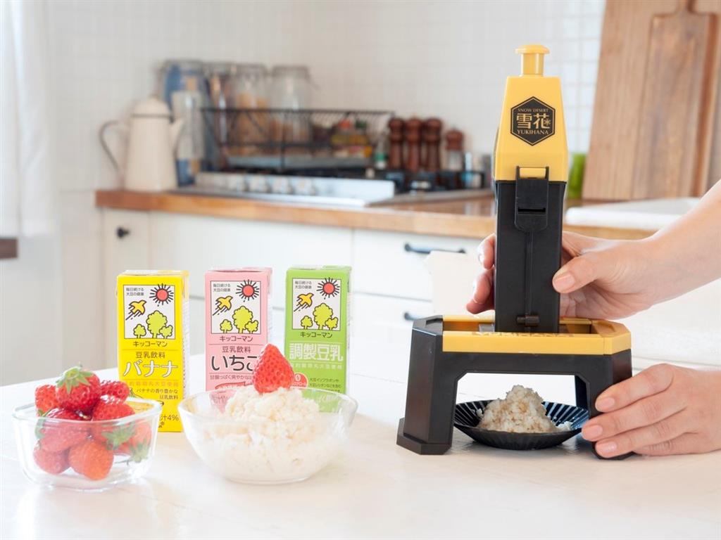 將冷凍的豆漿冰淇淋放入刨冰機,刨成蓬鬆的豆漿刨冰!搭配水果或煉乳一起享用。(圖片來源:キッコーマン豆乳)