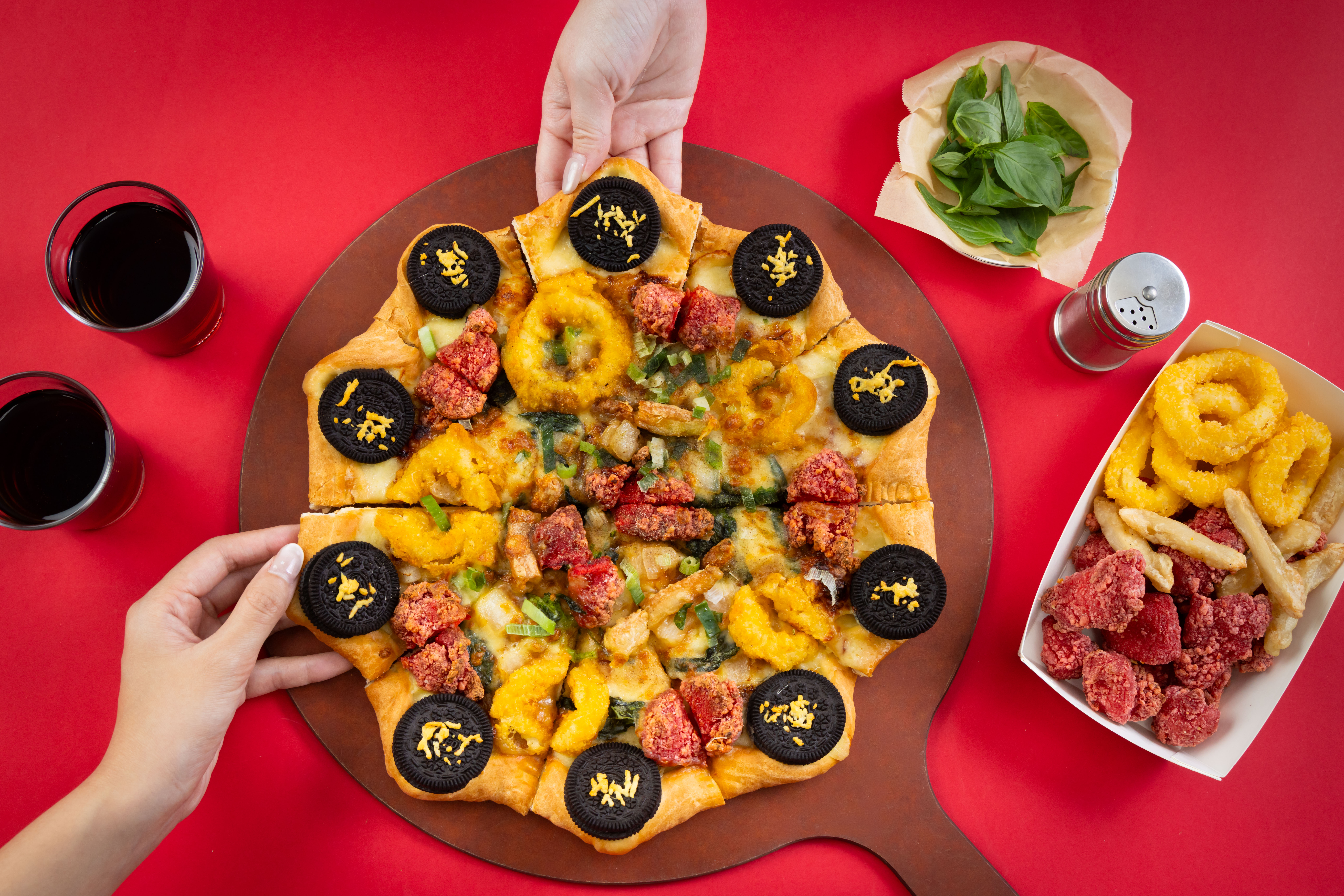 有趣的是,必勝客也不甘示弱,重新推出「OREO餅乾台味鹽酥雞比薩」,內容物包含鹽酥雞、魷魚、甜不辣,甚至還有那讓人滿頭問號卻欲罷不能的OREO巧克力餅乾,不知道該說是觀察入微,還是走火入魔。