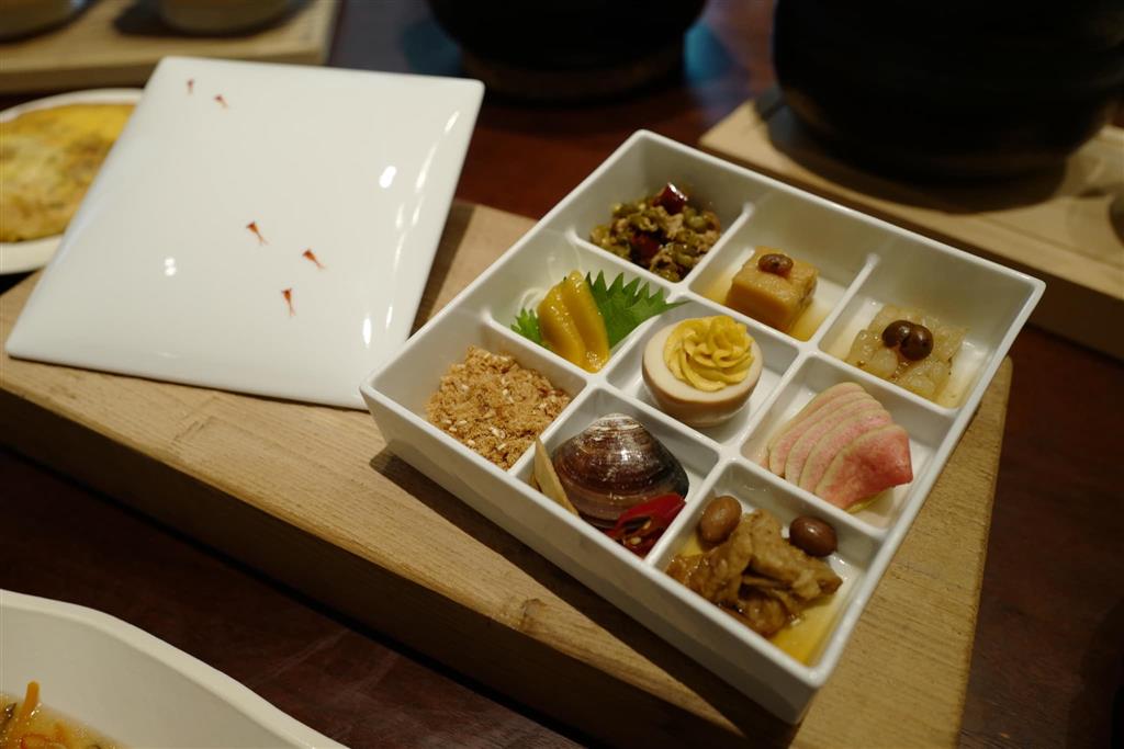 豆腐乳安坐於「九宮小菜盒」,漂亮的瓷器是林永勝老師特地請日本「李莊窯」量身打造。九格小菜樣樣有哏,其中,以柚子胡椒醃漬的生烏魚子,軟稠爆鮮,亮香鑽鼻,太有意思了!肉鬆也精益求精,山海樓郎師手炒台灣正黑豬,加進干貝鬆、猴頭菇鬆,融匯山海,滋味更豐。